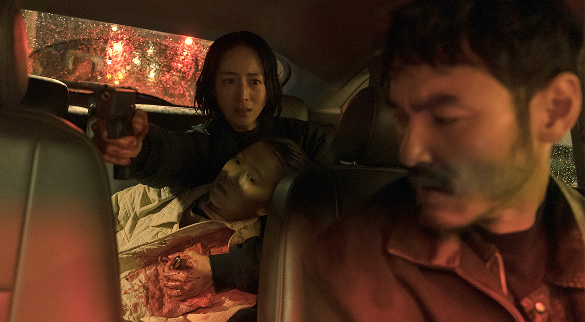 Detective Wu Jie pointing her gun at a serial killer (who can’t be seen in this picture) while holding onto the knife that was thrust into the heart of her junior assistant by the killer. The driver is You-Sheng Lin who is inadvertently helping with the investigation.