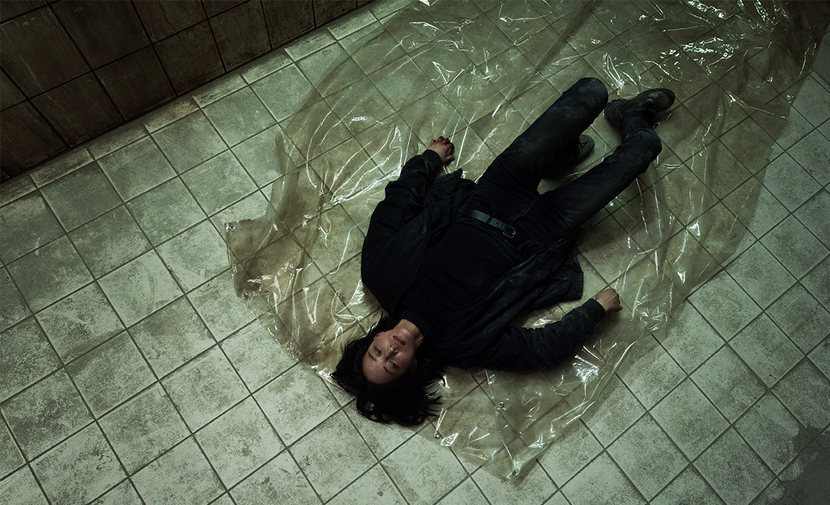 Detective Wu Jie pointing her gun at serial killer (who can’t be seen in this picture) while holding the knife in her junior partner’s heart.