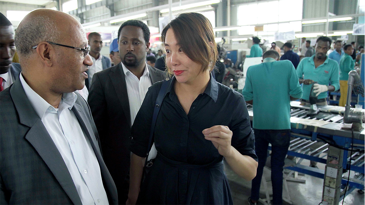 Chinese businesswoman Motto Ma speaking to members of an Ethiopian regional government delegation inside Eastern Industry Park, Oromia region. Photo credit: Max Duncan. Courtesy of Hard Truth Films.