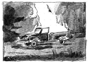 Oops! NIGHT OF THE LIVING DEAD graphic scene of getaway car going up in flames. © Copyright Coco Lin 2023