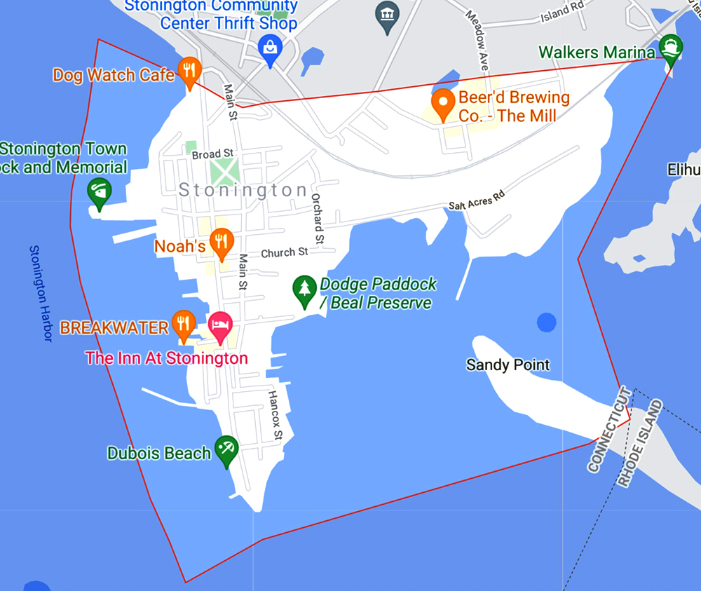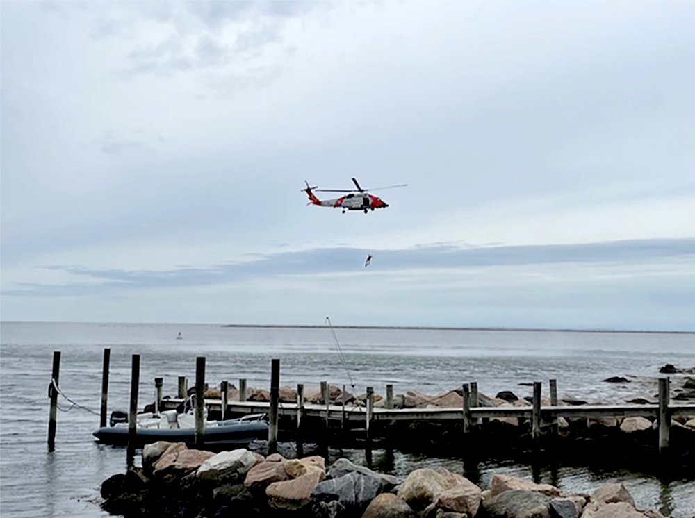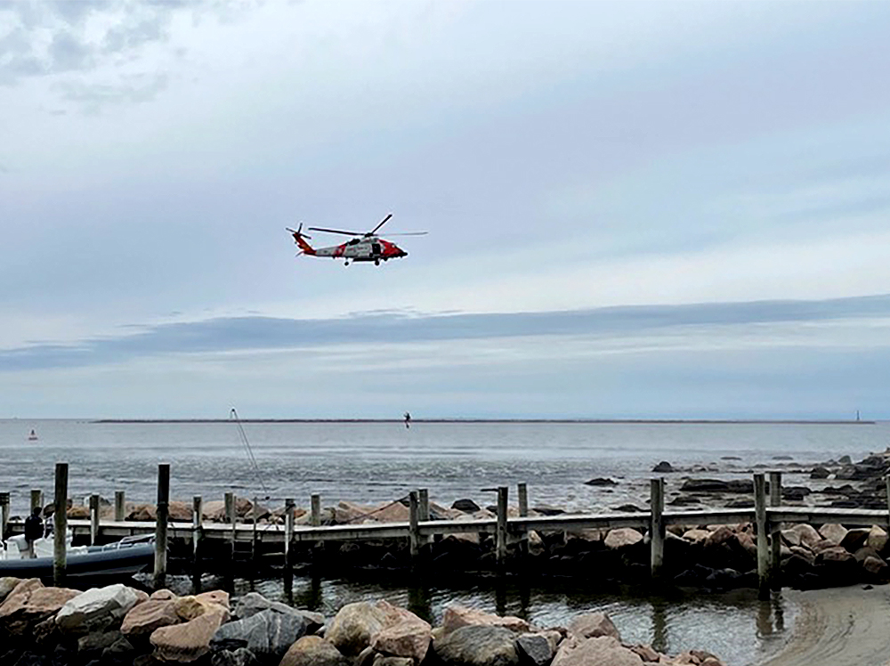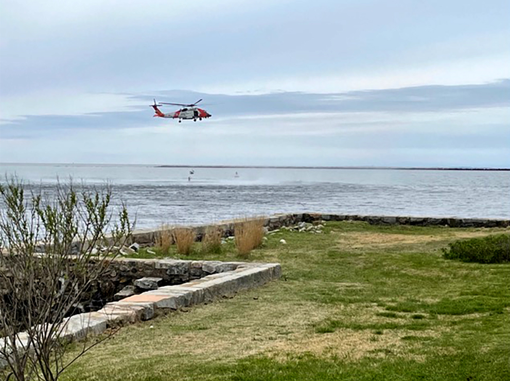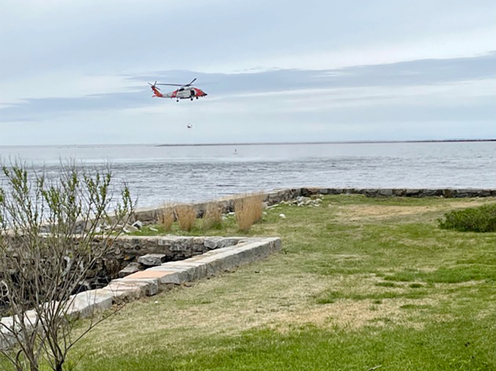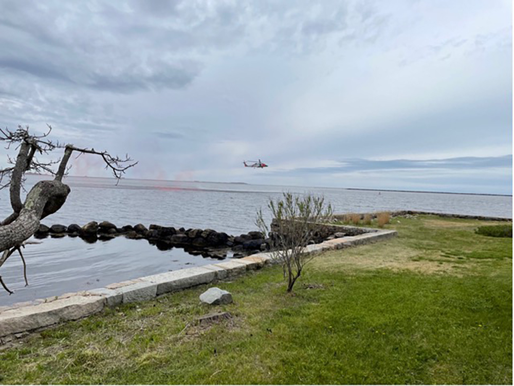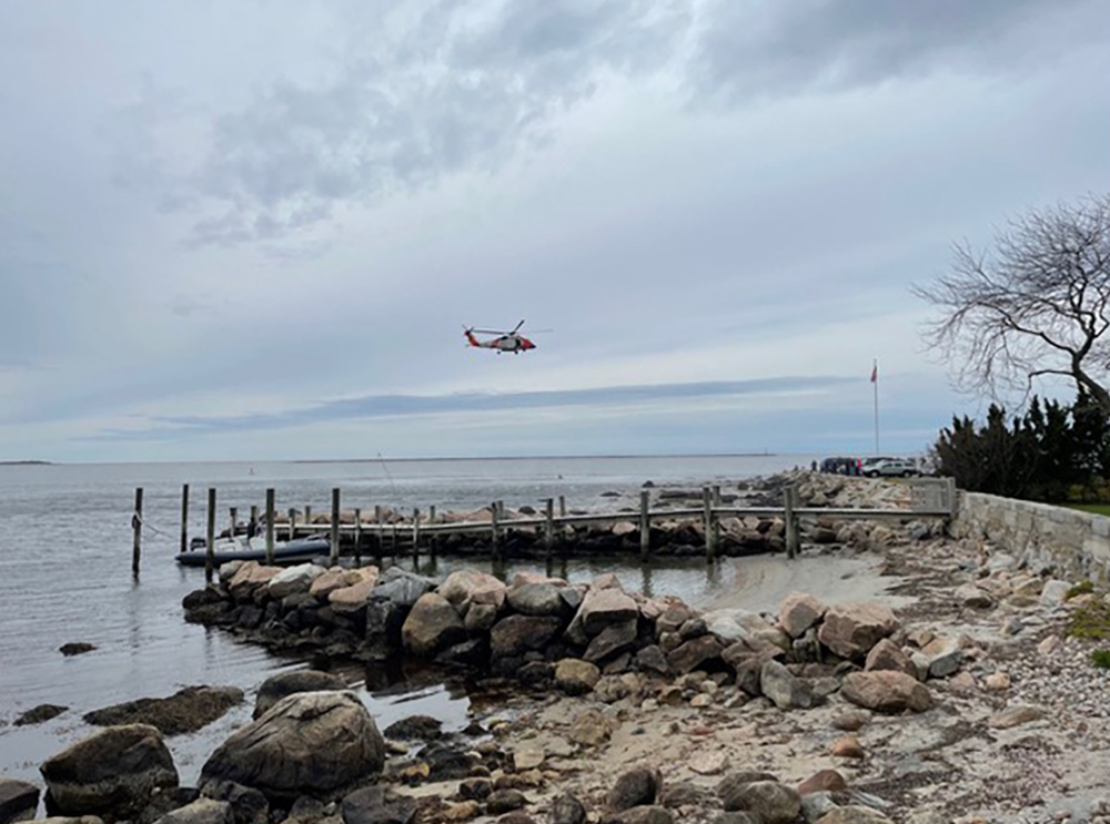 Stonington Borough, Connecticut – On a cloudy day, the whop-whop-whopping of a helicopter could be heard along the shoreline. The sound, referred to as blade slapping by aeronautical experts, came from an U.S. Coast Guard helicopter on a training exercise in the southeast side of the bay that bisects Sandy Point and the peninsula.