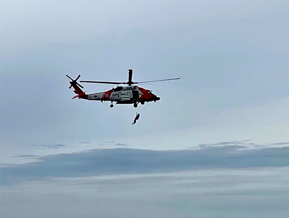 Stonington, Connecticut. A final, shot of the diver before fully lifted into the helicopter. Photo taken from the east lawn at the Lighthouse Museum. Picture by Marlena Freitas © Copyright 2021
