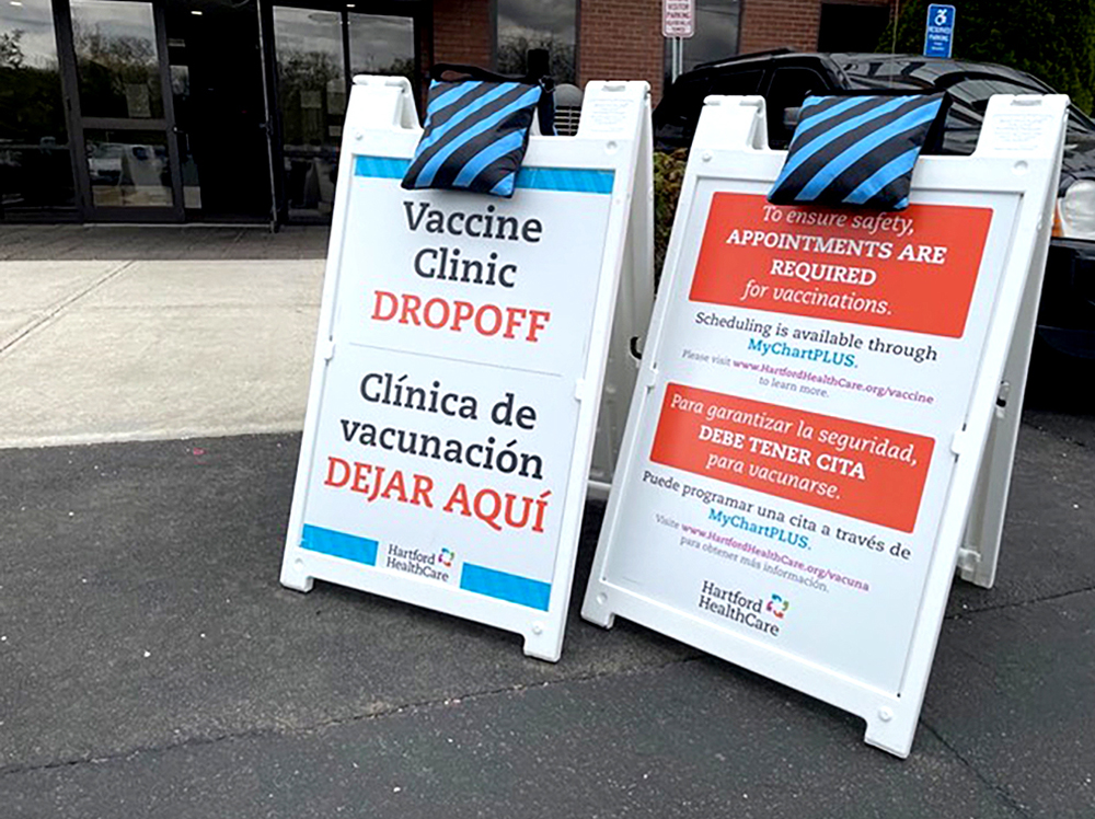 Wethersfield, Connecticut. Along the marked path in the Hartford HealthCare building, signs are posted. Prior to receiving the vaccine, patients are registered as having attended their vaccination appointment, and if needed, their second appointment is booked.