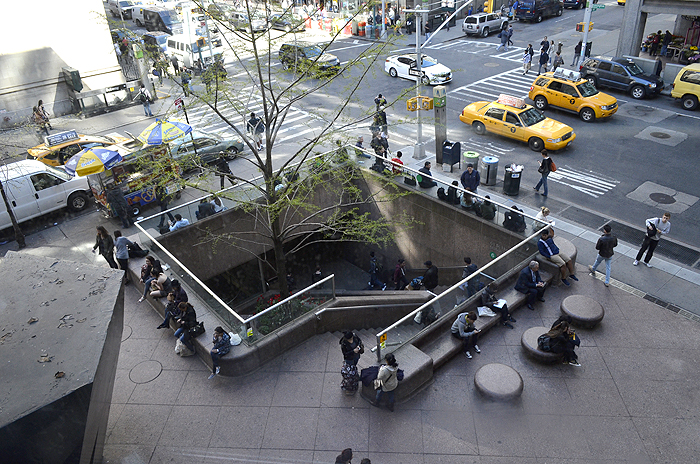 View of the 68th Street Lexington Avenue stop of the Number 6 IRT Train. Picture taken from third-floor corridor. Stock photo.