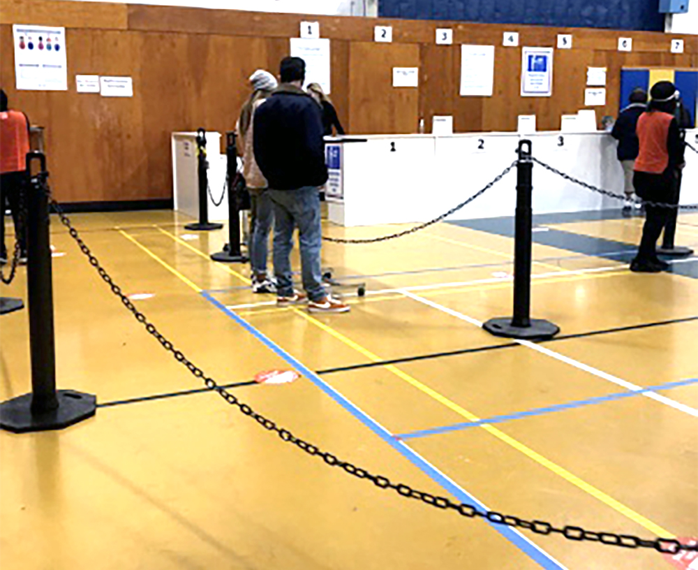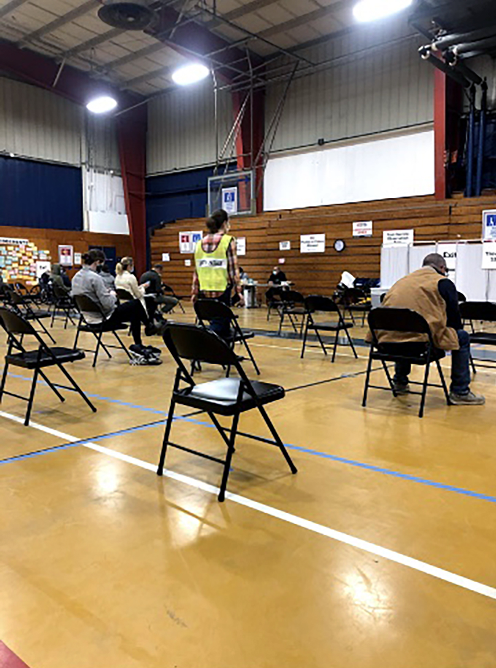 I then put my two masks on and walked over to the site, which was actually a gymnasium. I was met by a person wearing an orange vest at the entrance where my temperature was taken and I was asked if I had tested positive for COVID recently, or, if I was in contact with anyone with COVID. Once I answered all of their questions, I walked in and was greeted by more people in orange vests and there were several more stations to go through. Picture by Niamh McAuliffe
