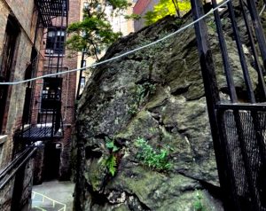 It’s at 100 14th in Harlem, and it’s called the Rat Rock. I’m working on it. It’s really cool. It is a cool rock. It’s owned, the Rock is owned by Columbia College, and I think Columbia College wishes that they did not own the Rock because it takes up so much real estate. It’s an outcropping of Manhattan Schist, which is the bedrock of Manhattan, the literal bedrock. And it’s so hard, it’s really hard to blow up. When you look at this rock, you can see where they drilled the explosives into it, the dynamite sticks in, and where they just didn’t. And it’s a really cool, it’s a little uncultivated wild space. It’s covered in beach trees. Rats love it. They call it the rat rock. But anyway, I’m making a little film about that with a local geologist like a New York City geologist.